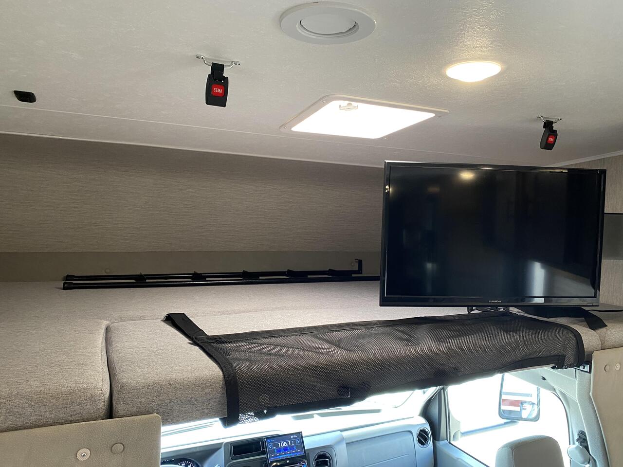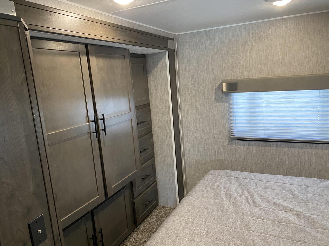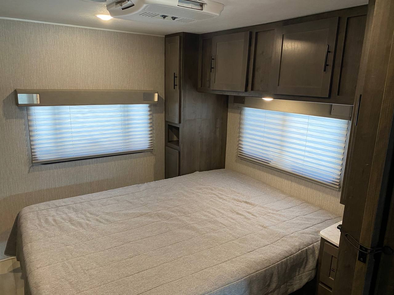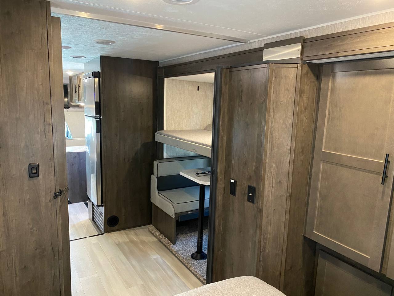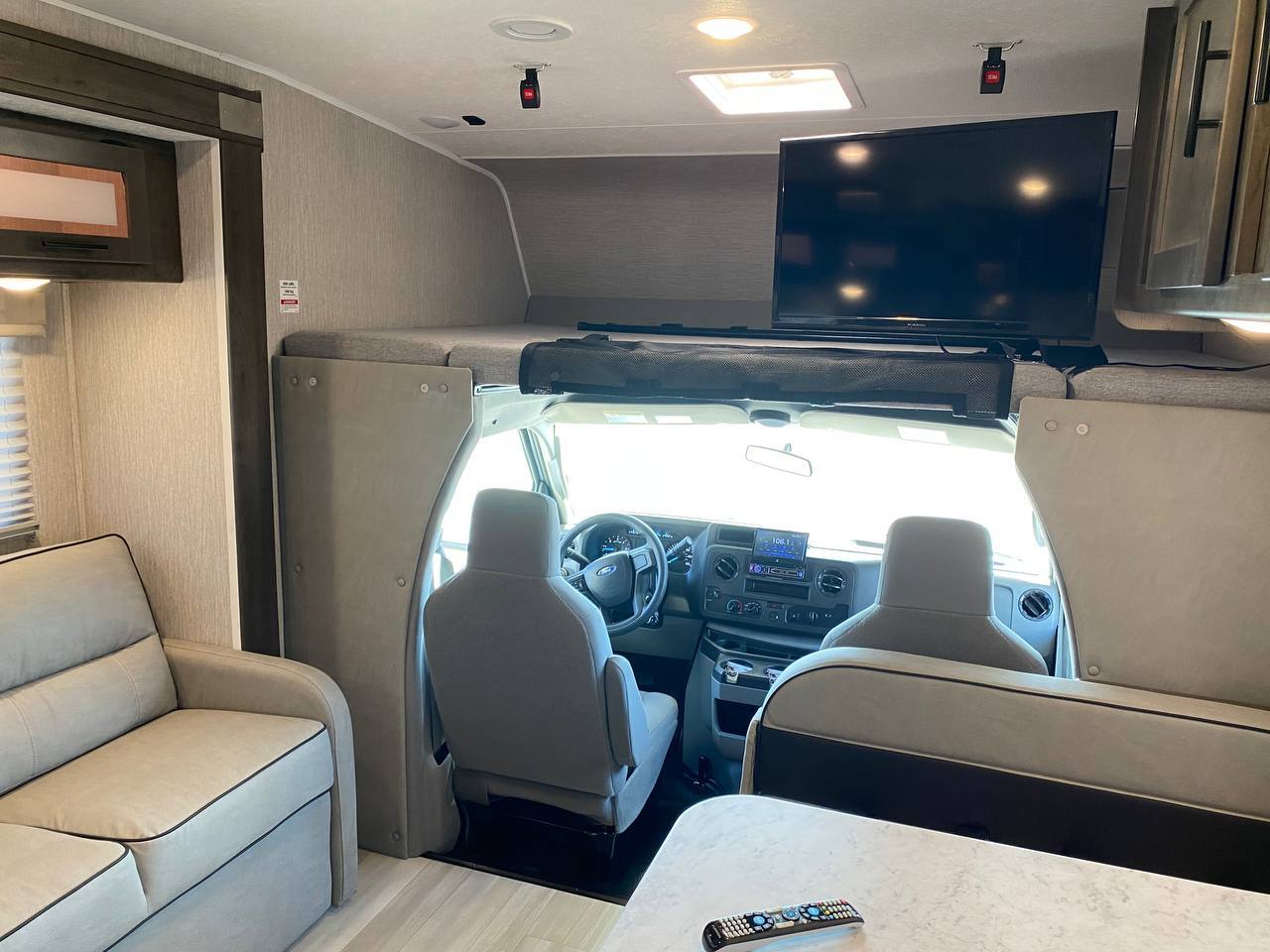 32 Foot Ford Leprechuan is one of the best solutions for a family trip, also this model is one of the most popular trailers for rent in Sacramento. Specifically, this trailer is non-slide, also there are sliding trailer in stock. A classic variant for a family of 8-10 people, tested by time and thousands of satisfied families.This model is convenient for both the driver and passengers. Despite the modest size, the interior is spacious and has everything you need. The shower and toilet are located comfortably in the corner, also there is a thoughtful kitchen with a large enough fridge.
